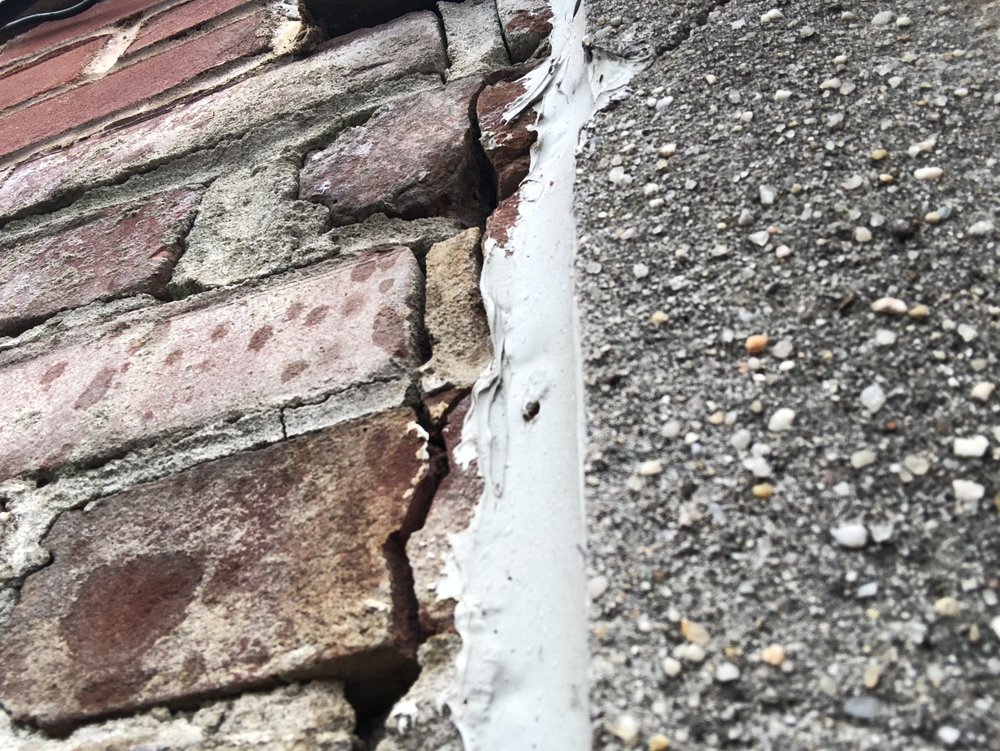 Hi all--I have been trying to get a better picture. This isn't a chimney. It is actually a wall. The sealant joint was done by a contractor after they removed the cement from the outer portion of the brick. It sure looks like that is what caused the crack, because the crack follows the sealant all the way down the wall. It is very difficult to get a good picture because I can't get into the neighboring building without trespassing onto their roof.