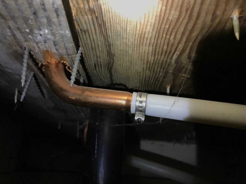 My gut says this isn't right. There's no transition piece between the copper and PEX, and it doesn't look like the tapered copper end is barbed like a proper male crimp fitting would be. Am I wrong? I can't recall ever seeing copper taper into PEX like this.