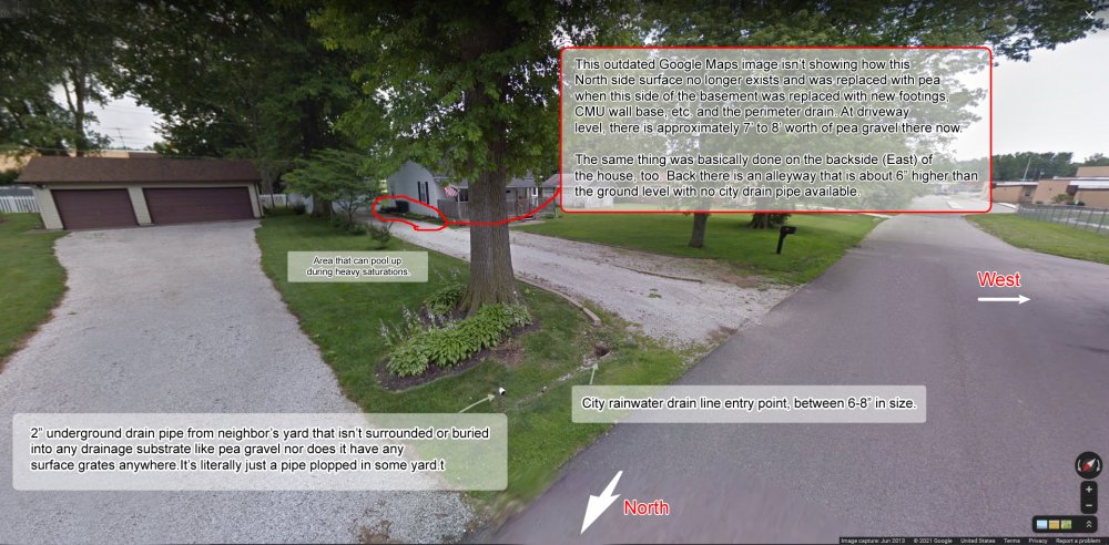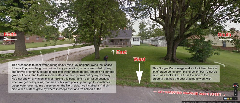 Pretty much. Looking at it from the outside, you wouldn't really think it because it doesn't show an obvious bowl landscape but once you see how water behaves during rains, you realize it needs grading but because of the property itself, it's just not very possible. The closest I might be able to do is take down a tree by the city street and then bulldoze the heck out of the land to grade down the street direction, but I'm not convinced it would be impactful enough to merit the money and effort. I've attached 2 images: both basically show the house and the land it sits on. I'll try to find one that shows the rear of the home and lot, but these two might give you an idea of what I'm up against. The South face has the best options where grading is concerned but considering how my perimeter drain sits basically 7-8 feet below the driveway level, it's somewhat moot from what I can tell, which is why we decided to bring the water into the basement to be pumped out to the city rainwater drainage (the 2" discharge pipe currently runs through some crawlspace and travels underground from under the add-on master bedroom on the South side of the home). Both images I was able to grab from Google Maps but neither show the 20' 4" solid PVC downspout extensions I currently have attached to the downspouts, with one being on the South corner of the porch and 2 being behind the home on the East side. The place that I get the most water is right there on the North-West corner: water tends to come in at a corner in the basement where the old wall meets up with new. Some of this is because the contractor made no effort to compact dirt or cement anything where the old block was exposed which runs underneath the porch. Instead, they simply dumped pea gravel down into the trench after putting a thin layer of tar sealer on their new walls whereby their masonry guy tried to seal everything as well as he could from the inside using some cut-to-size CMU along with mortar. So it's no surprise that water comes in right there and I'm currently trying to get a quote about how much it would cost to dig up the pea gravel and redo that as a worst-case approach, but it still wouldn't do anything about the water coming in as there's nothing that I think can be done about it from the outside.