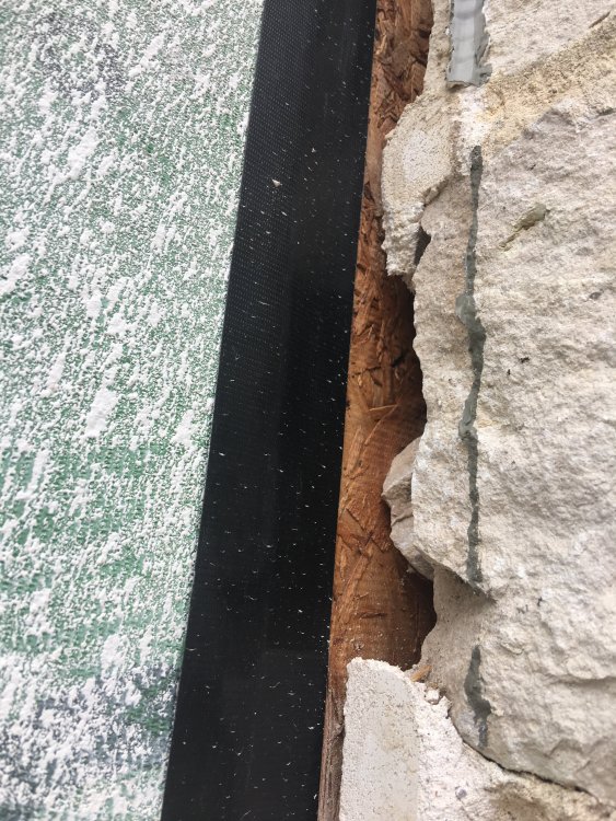 We removed a window on a home as part of a remodel and were surprised to find there is no vapor barrier between the masonry work and the OSB sheathing. The home was built in early 2000s in Dallas, TX with a full stone veneer, so it’s about 5-6” thick Austin stone. How did this ever pass a building inspection? I guess it had to, but I am surprised there is no vapor barrier behind this stone. From what I can tell there is no mold on the visible sheathing. In the photo the green board and black tape are covering the opening left by the window. The original OSB is visible behind the stone.