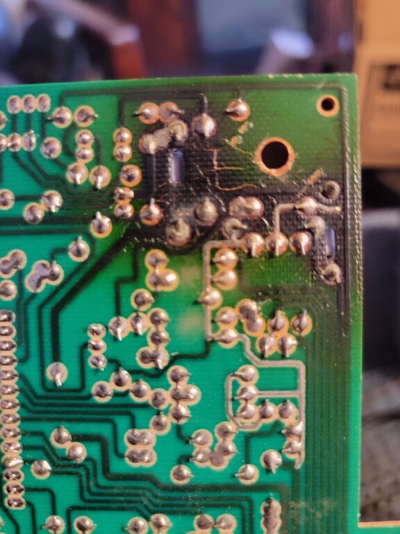 62-22737-08 On the back of the card it looks like a copper strip may have come off the board. My ohm meter can't track where the resistor goes on one leg and I see something suspicious looking on the board. This is also at the worst looking resistor, so if the board was damaged that's likely to be the spot. In the last image you can see an 'L' shaped piece on the board. It looks like a copper strip is missing there. I would love to see the front and back of a good board.