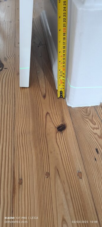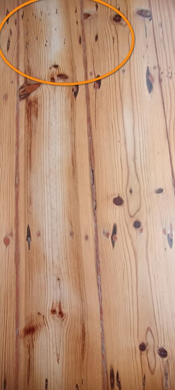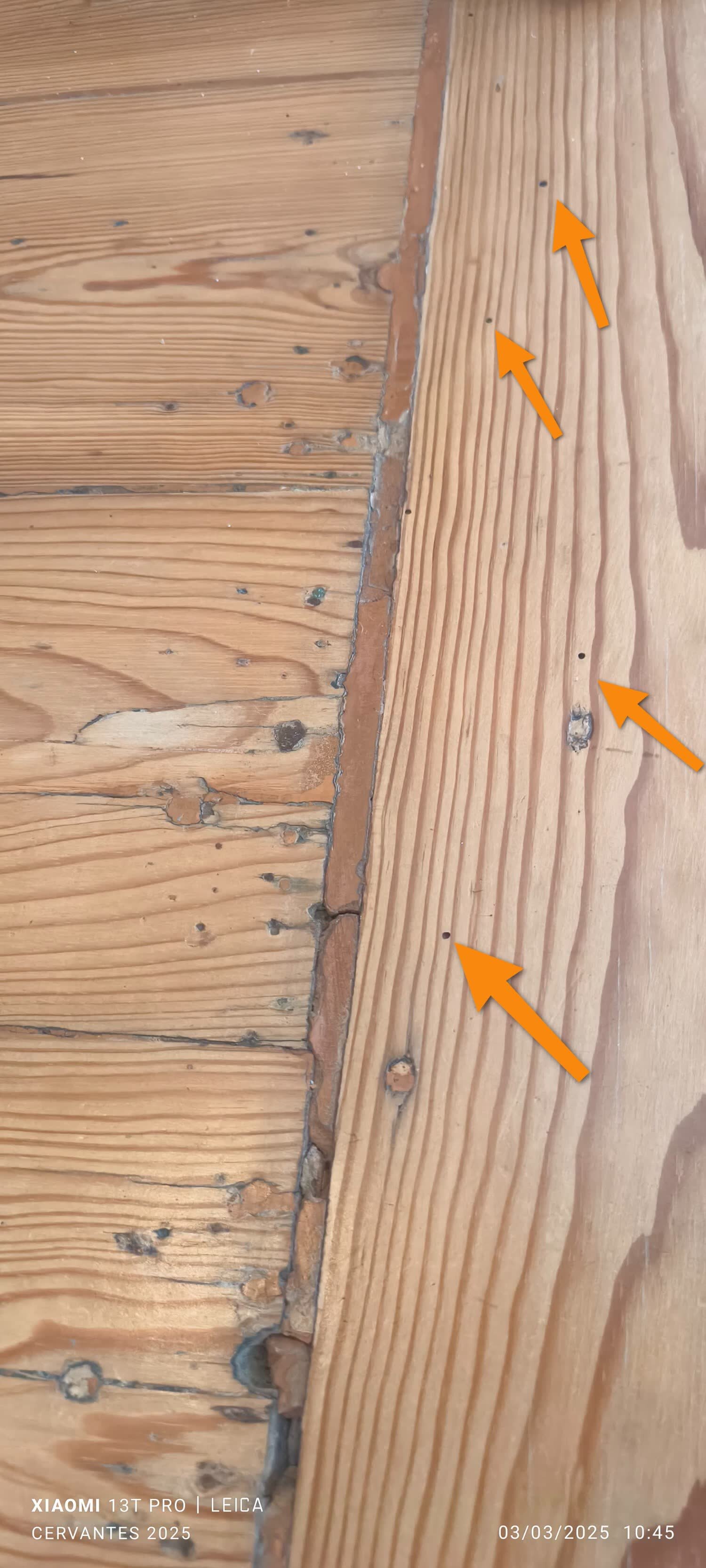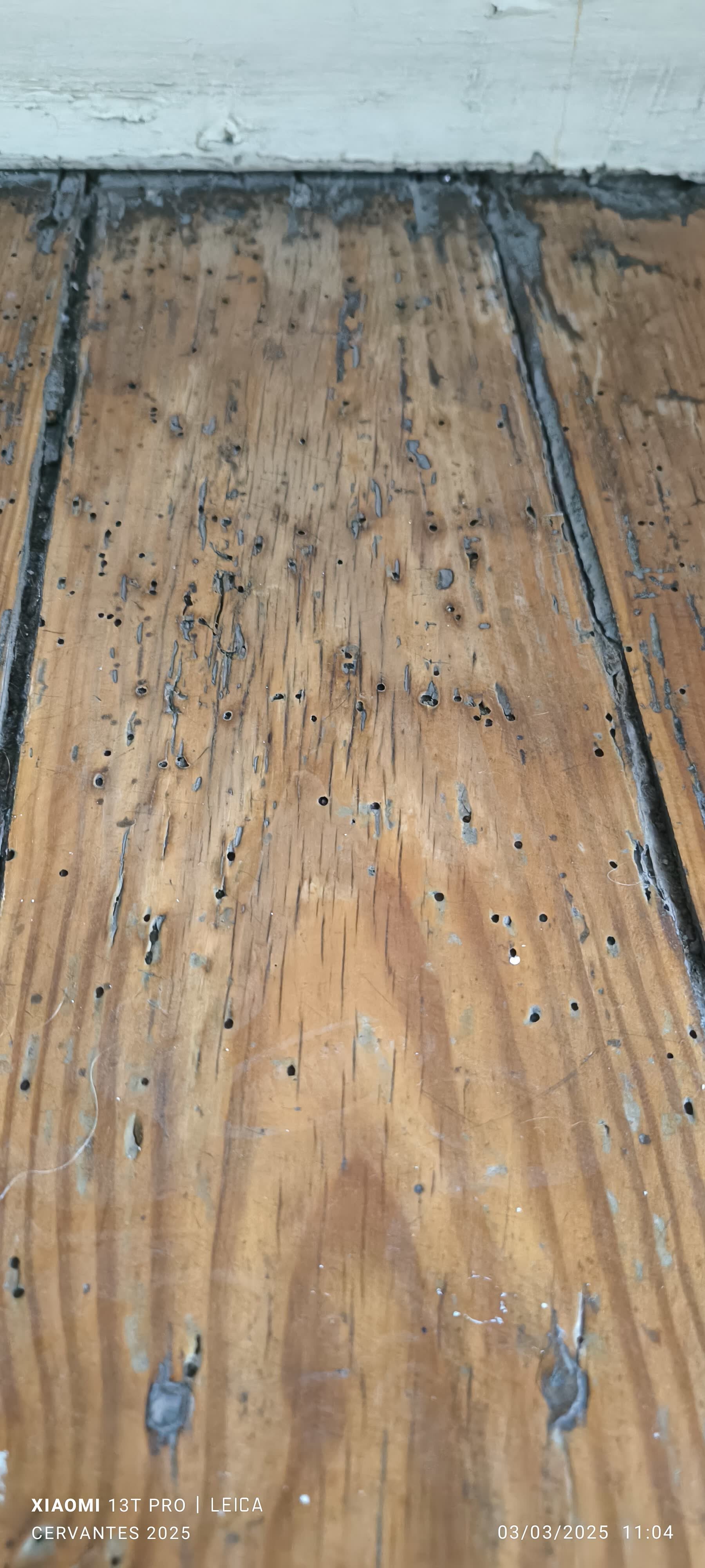 In the apartment itself, 1-2mm holes were also observed and the joist is likely infested, too, as evidenced by a slope, or sag to the floor (see pictures). Again, there were no signs of active infection but also no reason to believe that it isn't active.