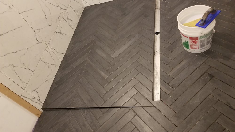 Marc, on the left is a channel drain. It has metal edging on it to make grouting cleaner and easier. The tiles are cut so the woodgrain pattern continues across the drain.