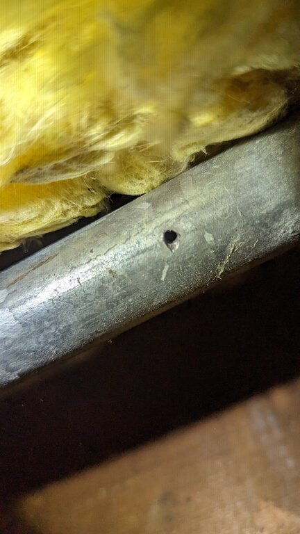 1. They checked every fitting and still leaked. When all quiet he could hear a slight noise. Cut hole in drywall and ran his fingers down the pipe. Drywall screw thru drywall support bracket into pipe.