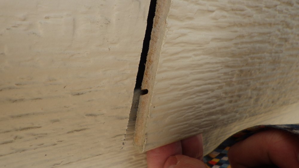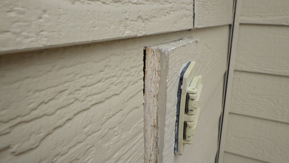 Looking for an ID please. 1985 home in Calgary and the siding looked great. All aluminum corners in place, all most all butt joints covers in place. I see a groove in the back of the (what I assume to be ) hardboard that is unlike anything I am familiar with. but then I see the cross section of the "blocks" at a telephone jack and older electrical cover plate and think it could be newer materials.