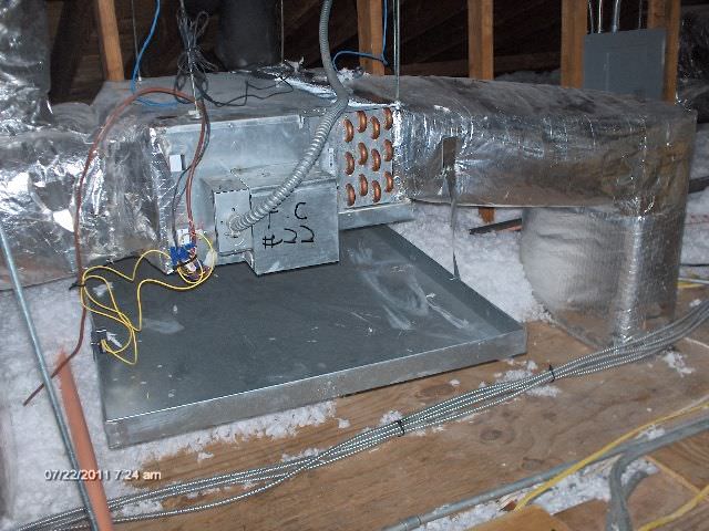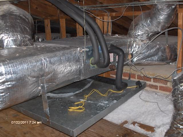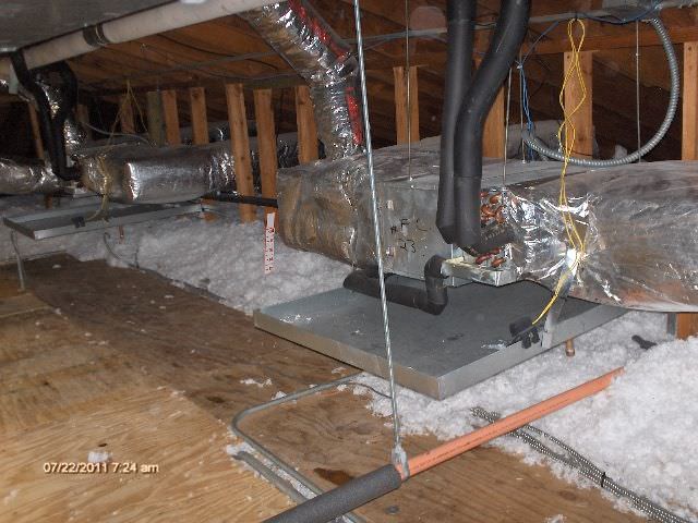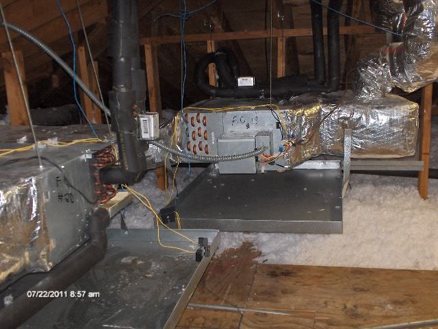 Phillip Posted July 23, 2011 Report Posted July 23, 2011 Here is where I did a little HVAC upgrade on one of the girlsââ¬â¢ house on the university here. Not as grand as Darrenââ¬â¢s project. I wish I had took photos before I started tearing out the fan coils We tore out 26 fan coils for the second and third floor. The second floor coils was above the ceiling and the third floor coils was in the attic We installed 22 new fan coils and 4 one-ton Mitsubishi Heat pumps for the sleeping porches. The 4 units work off one exterior unit. Here are some shouts of the Mitsubishi Heat pumps Click to Enlarge 81.01 KB in attic Click to Enlarge 73.02 KB Second floor sleeping porch Click to Enlarge 33.33 KB Click to Enlarge 44.45 KB We replaced the old water chiller with and new 10-ton chiller. Click to Enlarge 65.06 KB Click to Enlarge 53.2 KB What made this bad was the fan coil unit that they wanted us to use would take 8 weeks to get here so we had to order some fan coils that where larger to get them there in two weeks It is fun installing fan coil units thatââ¬â¢s 6 inches wider than the one that was there to start with above the ceiling in the hallways We had to move the control boxes to the side the coil hookup where on so we could have some room to pipe the chill water to the coils. 4 of the coils we had to mount the control boxes to the walls and had to pipe the control vales for the water away from the coils not next to them as they are installed most of the time. Here are some photos of the fan coils above the ceiling. Click to Enlarge 58.67 KB Click to Enlarge 46.93 KB Click to Enlarge 57.84 KB Click to Enlarge 51.59 KB Click to Enlarge 63.5 KB Here are some of the fan coils in the attic. Click to Enlarge 74.25 KB Click to Enlarge 69.48 KB Click to Enlarge 65.34 KB Click to Enlarge 68.46 KB Click to Enlarge 69.42 KB We also replaced an exhaust fan for the bathrooms in the attic. Click to Enlarge 66.26 KB These are shots of other items in the attic. Click to Enlarge 57.41 KB Also we added a 5 ton heat pump for added cooling in the dining and living room. It has a damper set up where they can have the unit blowing in both rooms or just one of the rooms. Click to Enlarge 44.23 KB Click to Enlarge 89.73 KB Click to Enlarge 43.03 KB The door facing had to be removed to get the unit in. In the basement we added a small Mitsubishi heat pump for the computer room. Click to Enlarge 63.12 KB Click to Enlarge 32.59 KB Click to Enlarge 34.73 KB