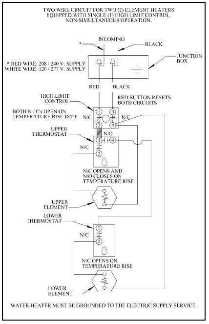Marc Posted January 13, 2012 Report Posted January 13, 2012 If the top element were bad, the thermostat (upper) would never turn on the bottom element. Not quite. Download Attachment: waterheaterwiringdiagram.jpg 102.33 KB There are three thermostats. They each actuate on a temperature rise. The high limit thermostat removes power from both lower thermostats when a defect has allowed the water temperature to reach the max design temp of the appliance. This resettable thermostat isn't field adjustable but is set by the factory. The two lower thermostats are each paired with a heating element and have a normally closed (NC) contact that energizes that respective element until the water temperature arrives at the preset value, whatever that is. To prevent both elements from becoming energized at the same time, the middle thermostat has an additional pole, this one a normally open (NO), that removes power from the lower thermostat whenever the upper thermostat is actuated. The appliance isn't intended to power both elements at the same time. Marc