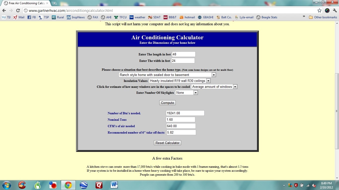 John Dirks Jr Posted February 11, 2012 Author Report Posted February 11, 2012 Here's a calc for the AC. 2 ton is more than enough. Download Attachment: AC-calc.jpg 193.54 KB BTW, how efficient do you think the 50 year old Mueller Climatrol is? 50-60% maybe? It has never struggled to keep up even on the coldest days. If its 60% and listed at 120k then that comes out to 72k actual usable heat for the living space. We never even came close to struggling with it on the coldest day. So, if a new Lennox 90% efficient is listed at 70k, that would come out to 63k usable. I bet that would do it. It might be a tad under sized in the coldest weather but that's not frequent. Even then, new and more efficient windows could be coming soon too. So based on my experience of living for and extended time with what I have now, the way my house acts and what my family needs to feel comfortable, that too can help me decide what I need as good as any calculator, can't it? I'll go look up some heat calcs now.