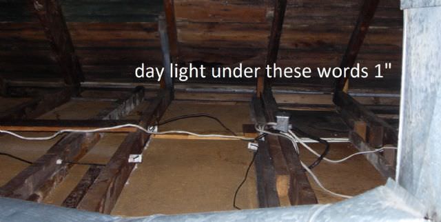 lucas980 Posted June 2, 2012 Author Report Posted June 2, 2012 here is what im talking about you can see a light strip under the words i put into the photo... that is an almost uniform one inch gap down both sides of the roof. fyi there are two mushroom cap vents, and there are no under soffit vents... it is raining today and except for one spot where the gap is filled with something like shims, everything is dry...only the shimmed spot has a little water coming in... note: the nob and tube wiring isnt live Click to Enlarge 35.45 KB