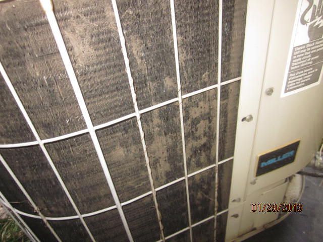 Marc Posted January 30, 2013 Report Posted January 30, 2013 Yes. I wouldn't be surprised. This one is from a recent inspection. Different brand but looks similar. Manufactured in 1981 Click to Enlarge 88.84?KB Guess how I checked it out. The exiting airflow at the top of the unit was directed at an angle of more than 45 degrees from vertical. It should be nearly vertical. Coil looked clean but in fact it's so badly clogged that a partial vacuum is below the fan and air above the fan is actually flowing downward, gets deflected by fan blades, leaves at that low angle. Very little air flowing through coils. Only happens on very old units. I learned thru experience as a serviceman that it's a long-term accumulation and very difficult to get out. Can't clean it at all if there's two layers of coil. Dirt gets stuck in between. Most AC guys my area make a feeble attempt at cleaning, then when they're called back later, tell the client the need a new condenser or even worse, a new system. Happens all the time here. Marc