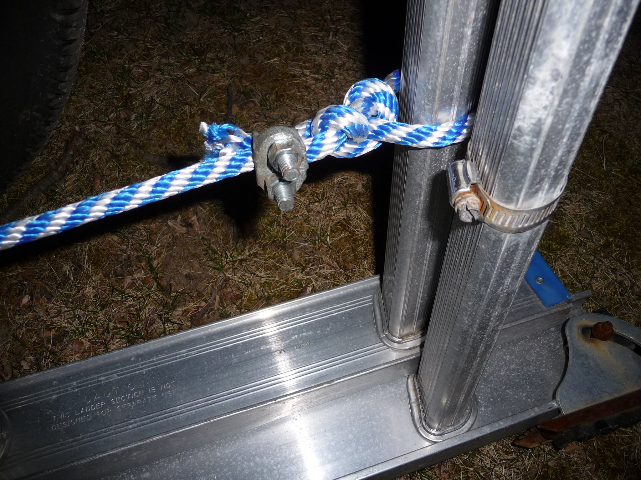 John Kogel Posted March 31, 2013 Report Posted March 31, 2013 32' of 3/8" poly braid from Lowes. $4 clothesline pulley from Walmart. The larger pulley surely makes retraction easier. It requires less friction from grip on the rope as the top section slides down. Less wear on the gloves too. Download Attachment: P1340111.JPG 1594.29?KB Nice one, John. The plain Jane pulley looks like it belongs there. Nice rope that will last. Gloves are good. I just wish you had used a Bowline knot on the rung. That is the knot that won't undo itself. Melt the end of the rope too, eh? []