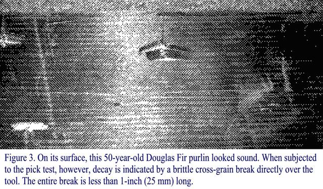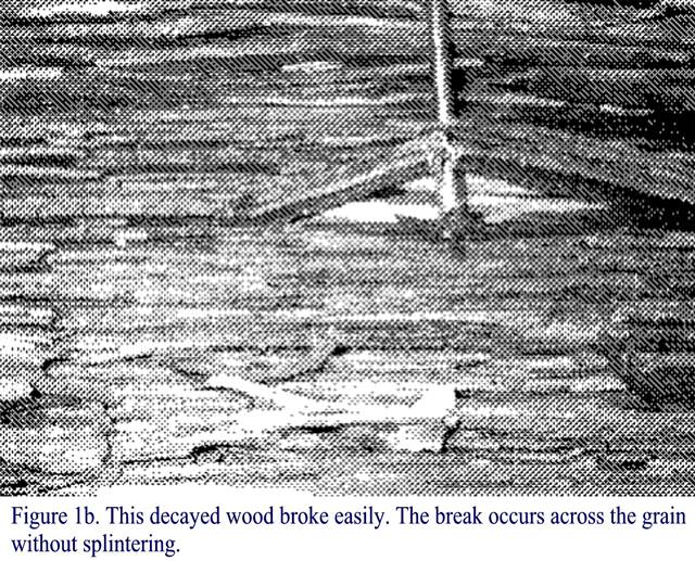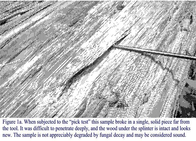 hausdok Posted August 8, 2005 Report Posted August 8, 2005 Detecting Early Wood Decay by Cheryl A. Anderson, Joseph R. Loferski and Dr. Frank E. Woeste, P.E. When asked to evaluate an existing wood structure, a structural inspector is concerned with two factors: building code conformance and structural integrity. Assuming all applicable codes are met, a close look at the connections and materials used is required to determine if they are capable of supporting the design loads. Initial designs are based on the assumptions of the use of sound graded lumber and allowable stress values for the grades used. From a structural engineer's point of view, the design and construction can only be valid for future service if the material is in its original condition, free of degradation. Several factors can contribute to the degradation of lumber, including fungal decay. The purpose of this Wood Bits? is to introduce and demonstrate the use of the "pick test"? as a tool for evaluating the condition of lumber and timbers that may contain early stages of fungal decay. Decay Facts Detection of early fungal decay is an important part of the evaluation of existing wood construction. Once such decay has set in it continuously grows and expands, further degrading the wood and eventually compromising the strength of the element. Fungal decay is common in areas near fasteners, joints, checks, end grain, paint discoloration, and where lumber and timbers are in contact with or near soil. The culprit is a form of primitive plant life. Requiring the presence of liquid water in the wood cells, decay fungi only attack wet wood. Protecting untreated wood from water is therefore critical to long-term durability. Decay fungi such as brown rot attack the cell wall material of wood, causing great losses in strength. For example, research indicates that with as little as a 3-percent weight loss due to decay fungi attack, there can be as much as a 70-percent loss of strength (Eslyn et al., 1979). Unfortunately, such small amounts of damage are difficult to detect visually without the use of a microscope (Forest Products Laboratory, 1999). The first strength property to be affected is toughness: the ability to withstand impact(Forest Products laboratory, 1999). With just a 1-percent weight loss wood loses 6 to 50 percent of its toughness, and with a 10-percent weight loss over 50 percent of toughness is lost. The "pick test"? described below is based on toughness and has been proven to detect decay with as little as 5- to 10-percent weight loss (Wilcox, 1983). The Pick Test The test involves using an ice pick to penetrate the wood surface in an area where fungal decay is likely or suspected. Similar tools such as an awl or even a small screwdriver can also be used. After penetrating the wood, the tool is rotated to pry a splinter, parallel to the grain, away from the surface. The appearance of the broken splinter is then used to determine if the piece is decayed. Because different species have different densities and all lumber is affected to some degree by its environment, applying the pick test in an area where the wood is known to be sound is a recommended means of establishing a "control"? for the remainder of the inspection. The test should be conducted in a late-wood zone (the darker and more dense wood fiber that forms during the later, dry part of the yearly growth cycle), although the test may also work in early wood zones. Then begin testing areas that are conducive to fungal decay, noting how much pressure is required to penetrate the surface. The penetration depth should be about ?-inch (6.4 mm). Pry out a small amount of the surface wood and compare the results to those of the non- decayed "control"? sample. Wilcox (1983) identifies three distinct modes of failure for decayed and non-decayed wood. Non-decayed wood will generally fail with either a fibrous failure or a splintering break, as shown in Figures 1a and 2 (Click images to enlarge). Decayed wood will have a brash, brittle failure with breaks directly over the tool. Very few splinters, if any, will appear and the break will occur across the grain, as shown in Figures 1b and 3. The samples pictured in Figures 1a and 1b were taken from a salvaged Douglas Fir log yard. Because the exterior of each is similarly weathered, they could be mistaken for being in comparable condition based solely on visual inspection. In a fibrous failure, the splinters are long and separate from the surface far from the tool, as shown in Figure 2 (virgin Douglas Fir), whereas a splintering break typically occurs directly over the tool with numerous splinters. Sound wood is very dense and in such good condition that penetration is difficult. The sound caused by the break can also be an indication of the quality of the wood. With non-decayed wood, the sound will be what one expects to hear when wood breaks. In contrast, when decayed wood breaks the sound will not be as loud and is sometimes barely audible. Conclusions The pick test is a simple, subjective test that is useful in detecting decay near the surface of wood members. With experience, the user will be able to identify fungal decay more readily and detect the subtle differences between decayed and non-decayed areas. The test is especially useful for inspections in which only knowledge of the presence of decay is needed. For example, we recommend that wooden members be replaced if any decay is detected in a residential deck or balcony. Due consideration should always be given to whether or not the lumber is pressure preservative treated when requiring the replacement of elements, and in determining the presence or extent of decay in large structures or where members are very costly or difficult to replace, additional tests such as coring, stress-wave mapping or even X-rays analysis should be considered. Questions and comments are welcome and may be sent to Dr. Woeste via e-mail at fwoeste@vt.edu. References Forest Products