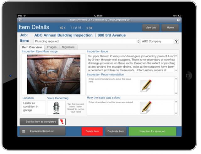 Detlef Posted October 6, 2013 Author Report Posted October 6, 2013 Checked, no downloads available for Mac's or PC's yet. By the screen layout, it's using an extremely similar (or the same) structure. Each comment is a record, each record has it's set of fields, etc., etc. My page layout is different, but that's easy to change. I can put up to 4 pics with each comment; also easy to change. The interface is the question; since there's no downloads yet, can't know anything. You know, I could alter my set up to be an inspection format for just about anything.... Hi Kurt. Thank you for your feedback re our i-inspectAnything inspection software. We are working on a run time demo for Mac or PC desktop. However, the best mobile experience is with the iPad. Once the i-inspectAnything PC run time version is up, I'll let you know, in the meantime, the iPad and iPhone version is available from here: http://www.i-inspectAnything.com, just use this link from your iPad, iPod Touch or iPhone. If you are interested to test the Cloud based online version of the i-inspectAnything mobile inspection system, please let me know and I'll make a link available to you. Click to Enlarge 49.19 KB Cheers Detlef PS: Yes, I agree, there is some bad software around, i.e. transfer entire files back and forth between their devices. I have seen a lot in 30 years of this business. Fortunately we don't have these problems