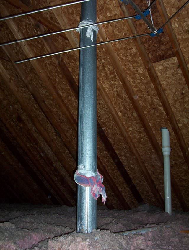 Mike Lamb Posted April 21, 2014 Author Report Posted April 21, 2014 Right, condensate leak at the vent connections. I always see at least some drip marks in the attic. They are often minor. Someone installed an insulated flex duct around this vent no doubt to deal with moisture. I know insulation should not touch the vent but this will probably work. Click to Enlarge 57.13 KB Click to Enlarge 38.57 KB And then there is always this method. Click to Enlarge 104.48 KB
