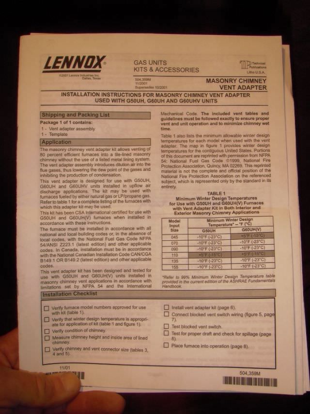 mjr6550 Posted May 7, 2014 Report Posted May 7, 2014 I saw something today that I had not seen before. 80% furnace vented to an exterior masonry chimney with a clay liner. Also venting a water heater. That part is not unusual. The chimney connector has a built-in damper and an opening to allow dilution air to enter the chimney. The instructions state that this allows venting of the furnace without lining the chimney. Of course, the venting kit is made by Lennox and is listed for use with several models of furnaces. The furnace that was installed is an Aire-flo (there are or were owned by Lennox), but the model numbers do not match. So unless the manufacturer says otherwise, it is still wrong, but interesting to know that this kit exists. Click to Enlarge 91.2 KB Click to Enlarge 57.47 KB