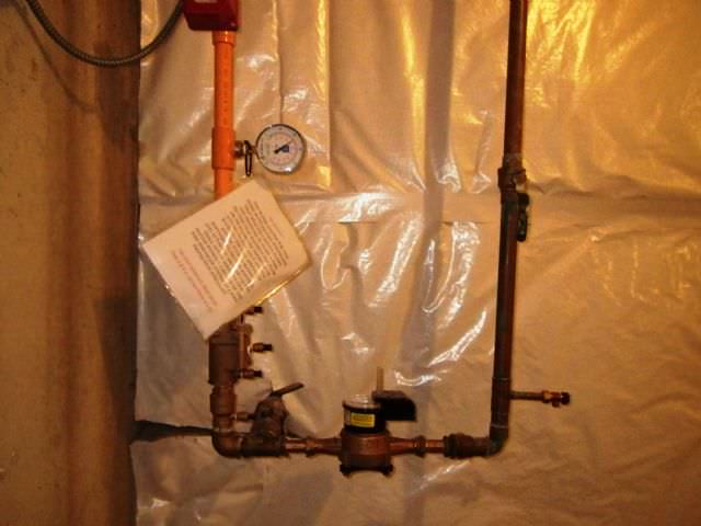 Jerry Simon Posted November 9, 2014 Author Report Posted November 9, 2014 I think you're right about 80 psi being the maximum for the SPPC (silver-painted-plastic-crap) we frequently see, but I don't have any concrete language for you. I would punt to a plumber for further evaluation if I came across 110 psi in any house, with or without a sprinkler system. Where is the service entrance? In the picture, immediately left of the water meter, through the back foundation wall (where if you look close, you can see the handle on the ball-valve water main is turned slightly off). It "T's" to the left to the sprinkler system, to the right to the domestic.