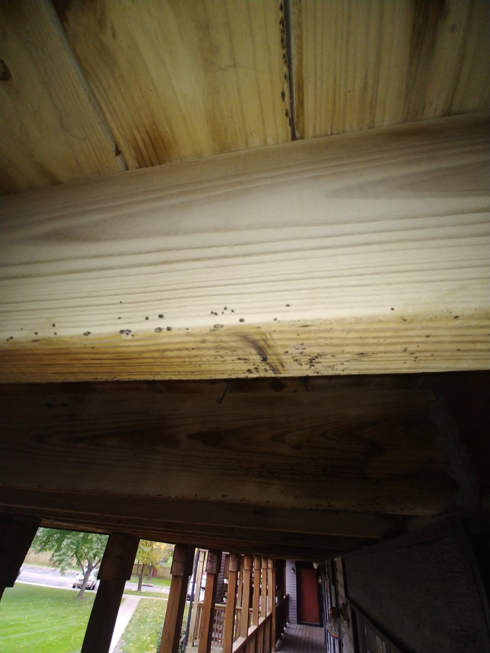 lakoma Posted October 13, 2019 Report Posted October 13, 2019 (edited) Hi there, I was curious if I could get opinions on this. Moved into these apartments quite sometime ago, but now that the weather is getting cold, we've decided to open up our windows for the last few weeks. I noticed these spots in summer but brushed it off as it was probably dirt. There are 3 levels to these apartments and 5 different buildings, each 3 levels. I'm assuming they do testing on these every year? Maybe not. It's all over the stairs and railings as well. Does this look like black mold or just dirt. It does look pretty dark but I don't know if it is completely black. I got up close to some of the spots and they are pretty large in size, the girth being like the size of little pebbles (quite a bit bigger than sand), I don't remember mold ever forming in these bigger pebble sizes, I always thought they were more velvety and flat, and grew in corners and stuff. I could be wrong. The hangers of wood above is because we are on the 2nd floor (middle floor) and there is people above us and below us. I'm concerned because we had the windows open, and my girlfriend is pregnant. What should I do? I feel like if I reach out to the landlord then nothing will be done, and something should have already been done about it. The black spots seem to form near the cracks of the wood. My only other thought is that since there are people above us the dirt from the floor is draining down when we get rain and forming this after drying. We are in the midwest. Thank you all! Edited October 13, 2019 by lakoma mispell