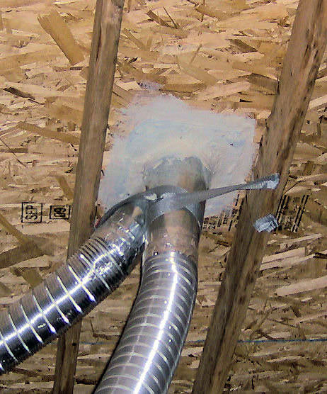 Bob White Posted May 6, 2006 Report Posted May 6, 2006 The photo below shows the roof penetration where four bath exhaust fan ducts terminate. Download Attachment: venting.jpg 104.91 KB This concerns me for a few reasons: First, due to weather yesterday, I was unable to climb a ladder, get on the roof (it was WAY too steep anyway), or even get a view of this penetration from the outside of the house even from a distance with binocs. Second, I have never seen this before. Upon close examination, you can see that this Wye fitting is either screwed or neiled or boltd to the underside of the roof sheathing. Then it is covered (sealed?) by the same type of mastic that the HVAC guys use to seal their ductwork at the evap. So, if the flashing up topside goes bad, it may be a very long time before anyone in the house notices the leak, resulting in some roof decking and shingle replacement along with the simple flashing boot replacement. My Questions: What is the proper name of that wye apparatus? Is this installation as wrong as I think it is? Bob