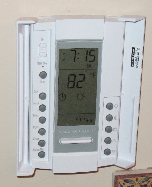 Jim Katen Posted March 16, 2008 Report Posted March 16, 2008 This bathroom had in-floor radiant heat. I couldn't figure out how to turn the damn thing on. This controller had a single button. When I pressed it, nothing happened. It's not a touch screen, the front panel doesn't flip up or slide out to reveal other controls and pressing the button for a long time or repeatedly does nothing. Can anyone tell me how this sucker works? I don't see anything resembling it at the Nuheat site. - Jim Katen, Oregon Image Insert: 35.24 KB
