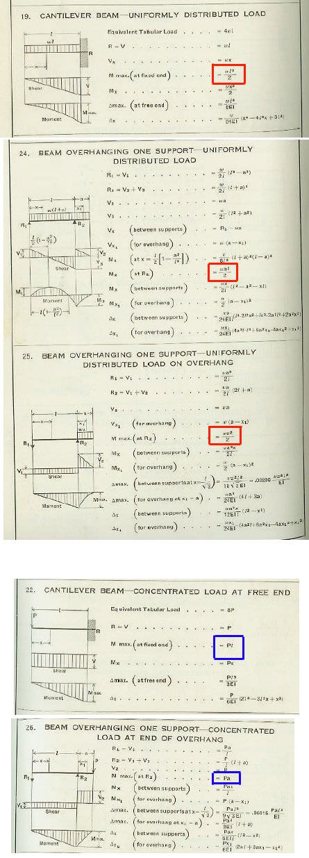 Jim Katen Posted June 30, 2009 Author Report Posted June 30, 2009 . . . The myriad of equations Jim posted define loads and deflections both in the cantilevered portion and within the span between the supports of the extended version. If you look only at the loads, and look only at the cantilever/overhang portion, that seething mass of mathematics simplifies to the same values for both configurations (as I've highlighted below). . . . But of course they're the same. I never said that they were different. My point is that the supports are different. - Jim Katen, Oregon