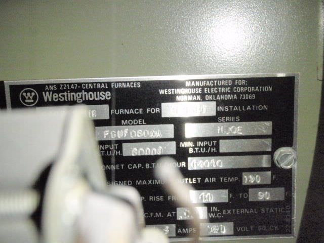 Jerry Lozier Posted September 27, 2009 Report Posted September 27, 2009 Anyone have an age on this furnace.... My Prestons guide does not have that model # Westinghouse Nat Gas Furnace....# FGUF080AA ....Ser.16301